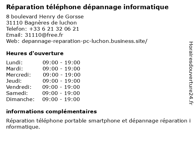 1 Informatique 31110 (Distance: 0,43 km) 4 Rue Colomic, 31110 Bagnères-de-Luchon 31110, informatique, logiciel, ordinateur, réparation 2 CHARLY SPORTS (Distance: 10,01 km) STATION LES AGUDES, 31110 GOUAUX-DE-LARBOUST charly, entretien et réparation matériel, forfait location ski pyrénées, location matériel, location matériel snow / ski, louer du matériel, raquette, snow, snowboard, sports, station de ski, versant agudes 3 Groupe Hamecher - Saint Gaudens VI - Mercedes-Benz (Distance: 34,55 km) . ZA des Pyrénées, 31210 Ponlat Taillebourg atelier, benz, camion, concessionnaire, garage, gaudens, groupe, hamecher, lourds, mercedes, neuve, occasion, poids, réparation, saint, vente, vi 4 Docteur Téléphone (Distance: 36,87 km) Place Saint Raymond, 31800 Saint-Gaudens docteur, dépannage, réparation, smartphone, téléphone 5 SFR (Distance: 36,92 km) 43 Rue De La Republique, 31800 Saint Gaudens compagnie de téléphone, magasin de téléphones mobiles, sfr, vente et installation du câble et du satellite 6 Easy Cash Estancarbon (Distance: 38,54 km) Avenue du Pic du Gar, 31800 Estancarbon cash, easy, estancarbon, jeux video occasion, livre pas cher, ordinateur reconditionné, ps4 occasion, rachat d'or, revendre mon téléphone, téléphone pas cher, téléphone reconditionné, vendre produits d'occasion, vendre son téléphone |