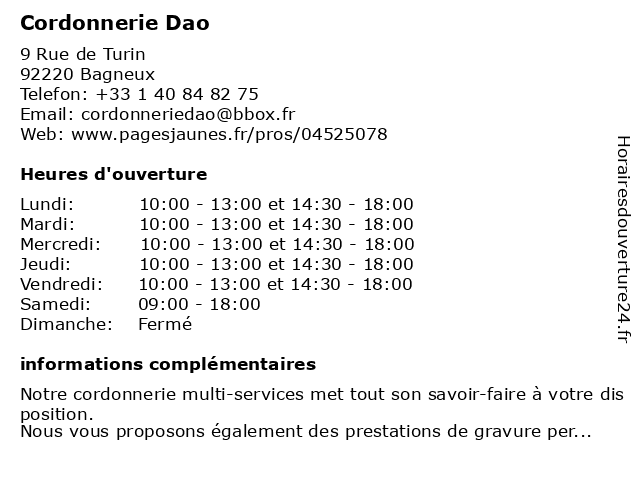 | Lundi | 10:00-13:00 et 14:30-18:00 |