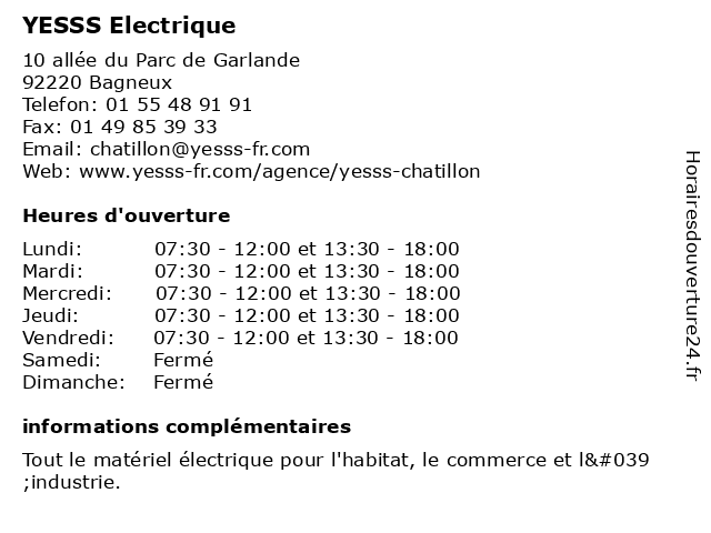 2 YESSS Electrique (Distance: 10,37 km) 6 rue Ambroise Crozat, 91120 Palaiseau appareillage, chauffage et climatisation, câbles, electrique, fils, gaines et conduits, installation, matériel électrique, outillage, sécurité, wissous, yesss, éclairage 3 4 YESSS ELECTRIQUE (Distance: 14,34 km) 32 34 Avenue Marc Sangnier, 92390 Villeneuve-la-Garenne electrique, yesss 5 YESSS Electrique (Distance: 16,93 km) 31 Rue du Pont aux Pins, 91310 Montlhéry appareillage, chauffage et climatisation, câbles, electrique, fils, gaines et conduits, installation, matériel électrique, montlhery, outillage, sécurité, yesss, éclairage 6 Renault - Borne de Recharge Electrique (Distance: 2,39 km) 59 Avenue Aristide Briand, 92120 Montrouge borne, de, electrique, recharge, renault, électrique |