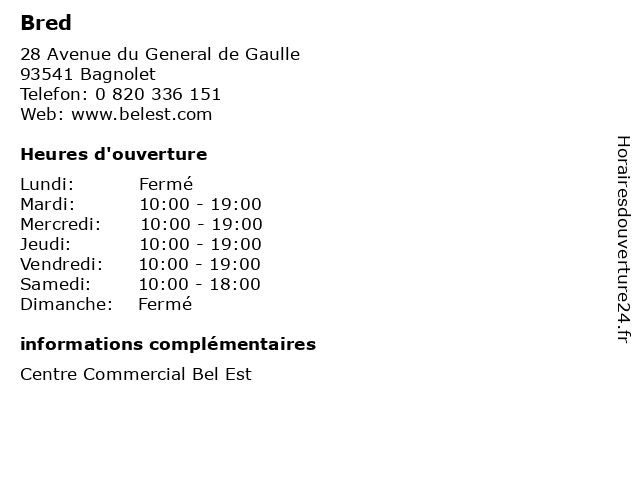 1 Bred (Distance: 2,37 km) 28 Avenue du Général de Gaulle, 93541 Bagnolet beaute, boutiques, brasserie, bred, cache, chaussures, concorde, deco, enfants, mode femme, mode hommes, restaurant, sport 2 Bred (Distance: 2,71 km) 4 Place de L'Europe, 94220 Charenton-le-Pont bay, bred, carrefour, centre, collegien, commercial 3 BRED (Distance: 5,89 km) 101 Porte Berger, 75045 Paris bred, chaussures, lingerie, mode enfant, mode femmes, mode hemmes, sport 4 Bred (Distance: 13,76 km) . Gendarme Castermant, 77500 Chelles bred, cafe, chaussures, enfants, homme, mode femme, restaurant, sport 5 Bred (Distance: 14,62 km) . Gendarme Castermant, 77508 Chelles bred, cafe, chaussures, enfants, mode femmes, mode hommes, restaurant, sport 6 Bred (Distance: 16,59 km) Residence Saint James, 77360 Vaires Sur Marne banque, banques, bred, commerciales, nationales, populaire |