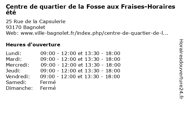Termes de recherche pour Centre de quartier de la Fosse aux Fraises-Horaires été:la, de, aux, horaires, services, centre, quartier, été, publics, fossé, fraises |