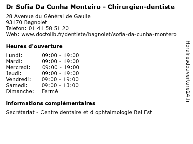 1 Dr Sofia Da Cunha Monteiro - Chirurgien-dentiste (Distance: 5,28 km) 15 Rue du Puits de l'Ermite, 75005 Paris chirurgie, chirurgien, cunha, da, dentaire, dentiste, dr, monteiro, montero, sofia 2 Dr Sofia da Cunha Monteiro - Chirurgien-dentiste (Distance: 8,17 km) 92-98 Boulevard Victor Hugo, 92110 Clichy chirurgie, chirurgien, cunha, da, dentaire, dentiste, dr, monteiro, sofia 3 Dr Johana Da Silva - Chirurgien-dentiste (Distance: 0,00 km) 28 Avenue du Général de Gaulle, 93170 Bagnolet chirurgien, consultation, da, dentiste, docteur, dr, johana, med, médecin, médecine, secrétariat, silva, traitement 4 Dr Sofia Gaspart - Chirurgien-dentiste (Distance: 0,00 km) 28 Avenue du Général de Gaulle, 93170 Bagnolet chirurgie, chirurgien, dentaire, dentiste, dr, gaspart, sofia 5 Bassega Da Silva Christelle Natacha (Distance: 0,87 km) La Banguissoise, 75020 Paris bassega, christelle, da, natacha, restaurants, silva 6 Da Cruz Silva Cardoso Jessica Soraia (Distance: 1,80 km) Pito Da Maria, 93260 Les Lilas cardoso, cruz, da, jessica, restaurants, silva, soraia |