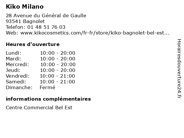 | 1 Kiko Milano (Distance: 4,70 km) 4 Place de l' Europe, 94220 Charenton-le-Pont beauté, cosmétique, kiko, maquillage, milano, soins 2 Kiko Milano (Distance: 4,93 km) 94 Rue de Rivoli, 75001 Paris beauté, cosmétique, kiko, maquillage, milano, soins 3 Kiko Milano (Distance: 5,08 km) 101 Rue Berger, 75001 Paris beauté, cosmétique, kiko, maquillage, milano, soins 4 Kiko Milano (Distance: 6,56 km) 109 Rue Saint-Lazare, 75009 Paris beauté, cosmétique, kiko, maquillage, milano, soins 5 Kiko Milano (Distance: 6,76 km) 13 Rue d'Amsterdam, 75008 Paris beauté, cosmétique, kiko, maquillage, milano, soins 6 Kiko Milano (Distance: 7,10 km) 63 Avenue de Fontainebleau, 94270 Le Kremlin-Bicêtre beauté, cosmétique, kiko, maquillage, milano, soins |
