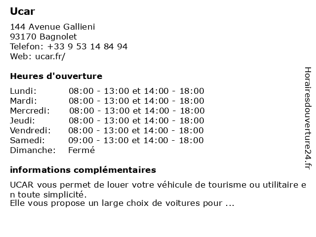 2 Ucar (Distance: 1,08 km) 57 avenue Gambetta, 93170 Bagnolet agence, autos, location, ucar, utilitaires 3 Ucar (Distance: 1,15 km) n/a Père Lachaise, 75020 Paris outils à louer, réservation, ucar, voitures à louer 4 Ucar (Distance: 1,17 km) 51 Rue des pyrénées, 75020 Paris outils à louer, réservation, ucar, voitures à louer 5 Ucar (Distance: 1,59 km) 41 Cours de Vincennes, 75020 Paris outils à louer, réservation, ucar, voitures à louer 6 |
