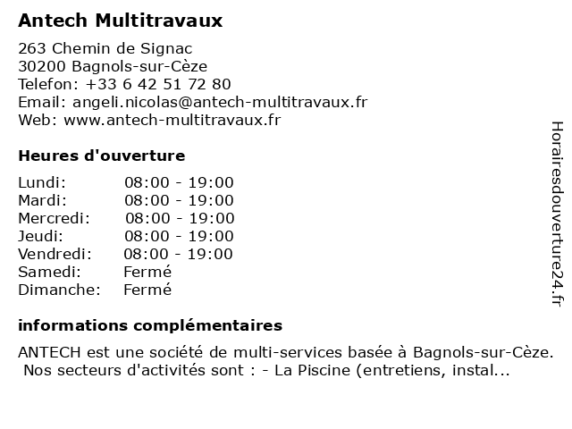 ANTECH est une société de multi-services basée à Bagnols-sur-Cèze. Nos secteurs d'activités sont : - La Piscine (entretiens, installation filtration, traitement, pompe à chaleur, ventes d'...