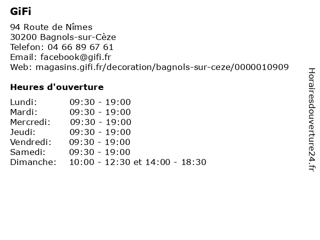 1 GiFi (Distance: 18,28 km) - Rue d'Italie, 84100 Orange bureau, cuisine, décoration, gifi, jardin & plein air, salle à manger, salon, stockage - salle 2 GiFi (Distance: 18,64 km) - Chemin La Palud, 84100 Orange cuisines, decoration, entretien, gifi, jardin, linge de maison, mobillier 3 GiFi (Distance: 20,68 km) - Avenue Jean Moulin, 84500 Bollene ameublement, cadeaux, décoration, gifi, maison 4 GiFi (Distance: 22,86 km) - Pont des Charrettes, 30700 Uzes cuisines, decoration, entretien, gifi, jardin, linge de maison, mobillier 5 GiFi (Distance: 23,71 km) 7 Rue des Alizés, 30133 Les Angles bureau, cuisine, décoration, gifi, jardin & plein air, salle à manger, salon, stockage - salle 6 GiFi (Distance: 31,84 km) 453 Avenue Pierre Beregovoy, 84000 Avignon ameublement, decoration, electromenager, gifi, maison |