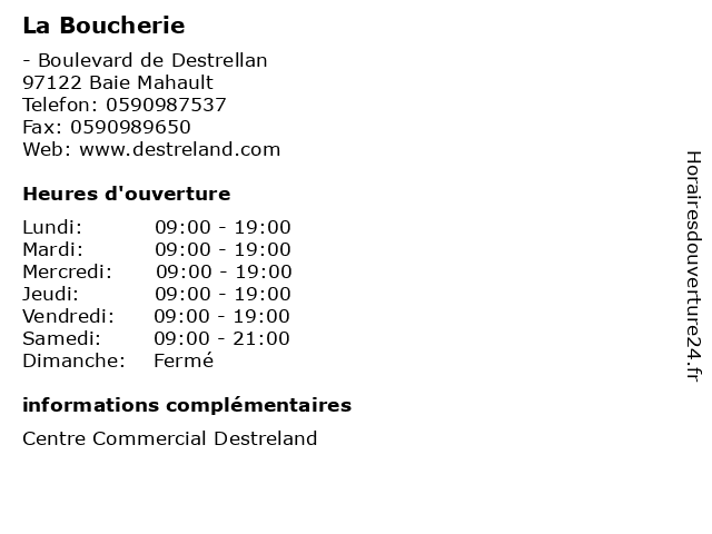 1 La Boucherie (Distance: 0,54 km) . Boulevard Destrellan, 97122 Baie-Mahault boucherie, cafe, chaussures, enfant, femme, homme, la, mode, restaurant 2 La Boucherie (Distance: 3,50 km) . De Destrellan, 91722 Baie-Mahault boucherie, cafe, chaussures, enfants, la, lingerie, mode femmes, mode hommes, restaurant, sport 3 U boucherie by STVA (Distance: 6,33 km) 6 Rue Des Cités Unies, 97110 Pointe-à-Pitre boucherie, by, stva 4 Casa Della Pasta (Distance: 0,00 km) - Boulevard de Destrellan, 97122 Baie Mahault boissons, casa, della, nourriture, pasta, restaurant 5 Candyland (Distance: 0,00 km) - Boulevard de Destrellan, 97122 Baie Mahault boissons, candyland, nourriture, restaurant 6 Cochon (Distance: 0,00 km) - Boulevard de Destrellan, 97122 Baie Mahault boissons, cochon, nourriture, restaurant |