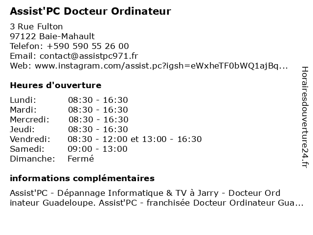 1 Cabinet médical du Docteur Anzala (secrétariat ) (Distance: 0,45 km) 772 Bd de Houelbourg, 97122 Baie-Mahault anzala, cabinet, consultation, docteur, du, médecins, médical, santé, secrétariat 2 Mon cabinet médical Docteur Muriel Burnel (secrétariat ) (Distance: 0,45 km) 3 Houelbourg, 97122 Baie Mahault burnel, cabinet, consultation, docteur, mon, muriel, médecins, médical, santé, secrétariat 3 Assist'Pc (Distance: 0,87 km) 3 Rue Ferdinand Forest Zone Industrielle De Jarry, 97122 Baie mahault assist'pc 4 Clinique Vétérinaire du Docteur Leveque Frédéric (Distance: 4,00 km) 45 Lots Belles Vues de Convenance, 97122 Baie-Mahault animal, blesse, chenil, clinique, docteur, du, echographie, frédéric, garde, horaires, leveque, nac, portee, radiographie, soins, trouvee, urgence, veterinaire, vétérinaire 5 PULSAT INFORMATIQUE ELECTROMENAGER (Distance: 0,42 km) 17 LOT AGAT - IMMEUBLE TECHNOPOLIS, JARRY, 97122 baie mahault cuisiniere baie mahault, electromenager, electromenager de marque baie mahault, frigidaire baie mahault, informatique, machine à laver baie mahault, magasin d electromenager baie mahault, magasin d informatique baie mahault, portable, pulsat, smartphones baie mahault, vente materiel informatique baie mahault, vente pc baie mahault |