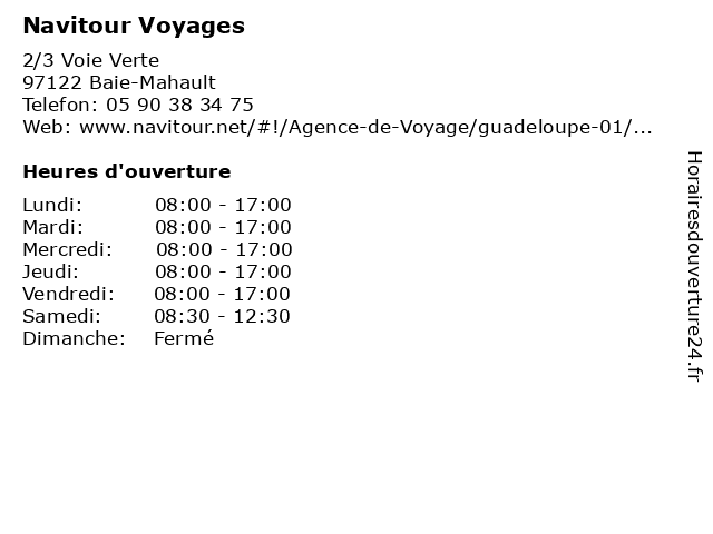 1 Navitour Voyages (Distance: 3,79 km) 11 rue Achille René Boisneuf, 97155 Pointe-à-Pitre agence, navitour, voyages 2 Selectour - Navitour Voyages (Distance: 0,45 km) 2/3 Voie Verte, 97122 Baie-Mahault billets de train, latitude, navitour, selectour, séjours, vols, voyage, voyages 3 Sunny Caraïbes Voyages (Distance: 0,49 km) - ZI Houelbourg Sud, 97122 Jarry agence, caraïbes, circuits, hôtel, réservations, sunny, séjours, vacances, vol, voyages 4 Havas Voyages (Distance: 0,51 km) . ZAC de Houelbourg Sud II, 97122 Baie Mahault agence, havas, organisation, séjours, tourisme, voyage, voyages 5 West Indies Voyages (Distance: 1,81 km) 62 boulevard de la pointe jarry, 97122 Baie Mahault agence, billet, d'avion, de, indies, service, voyage, voyages, west 6 Selectour - Navitour Voyages (Distance: 2,31 km) 320 Galerie Commerciale Destreland, 97122 Baie-Mahault billets de train, latitude, navitour, selectour, séjours, vols, voyage, voyages |