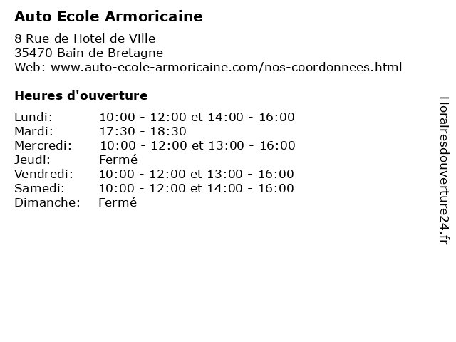 1 Ecole de conduite Armoricaine (Distance: 16,20 km) 48 Rue du Général Leclerc, 35580 Guichen armoricaine, auto, conduite, de, ecole, formations, groupe, école 2 Auto École ECF Armoricaine (Distance: 24,63 km) - Avenue de la Mairie, 35310 Chavagne 35, armoricaine, auto, cesr, ecf, école 4 Ecole de conduite Armoricaine (Distance: 28,24 km) 11 Place de la Mairie, 35310 Chavagne armoricaine, auto, conduite, de, ecole, formations, groupe, école 5 MMA Assurances BAIN DE BRETAGNE (Distance: 0,11 km) 8 Rue des Merhands, 35470 Bain-de-Bretagne assurance au tiers, assurance auto, assurance auto au tiers, assurance auto pas cher, assurance auto tous risques, assurance habitation, assurance habitation pas cher, assurance local, assurance multirisque, assurance professionnelle, assurance santé, assurance tous risques, assurance voiture, assurances, bain, bretagne, de, flotte, garantie décennale, mma, mutuelle, mutuelle sénior, rc pro, responsabilité civile 6 Auto-École Bainaise (Distance: 0,14 km) 3 Place République, 35470 Bain-de-Bretagne auto, auto école, bainaise, code, cours, formation, permis, école |