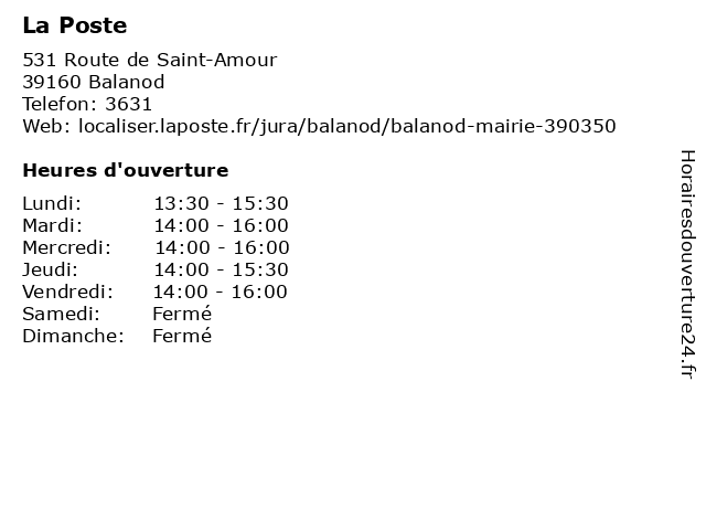 1 La Poste (Distance: 2,30 km) 2 Avenue Lucien Febvre, 39160 Saint-Amour express chronopost, la, poste, réexpédition internationale 2 La Poste (Distance: 8,11 km) 16 Le Chapitre, 39320 Gigny express chronopost, la, poste, réexpédition internationale 3 La Poste (Distance: 8,58 km) 25 Grande Rue, 28290 Digny express chronopost, la, poste, réexpédition internationale 4 La Poste (Distance: 11,70 km) 30 Place de la Mairie, 71580 Frontenaud express chronopost, la, poste, réexpédition internationale 5 La Poste (Distance: 12,14 km) 113 Rue du Grand Brulé, 01270 Verjon express chronopost, la, poste, réexpédition internationale 6 La Poste (Distance: 14,64 km) 64 Grande Rue, 01851 Marboz express chronopost, expédition, la, poste, réception des envois, réexpédition internationale, timbres |
