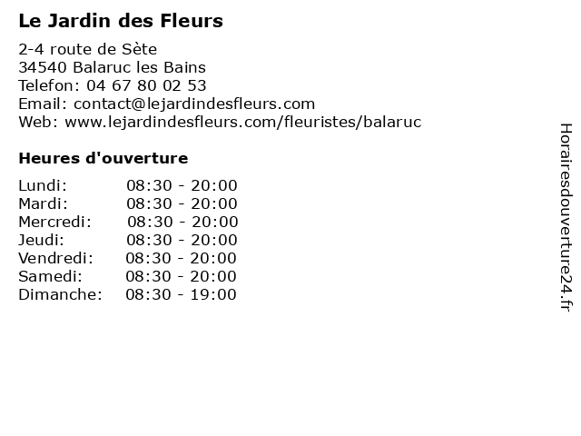 1 Le Jardin des Fleurs (Distance: 4,38 km) 12 boulevard Camille Blanc, 34200 Sète des, fleuristes, fleurs, jardin, jardineries, le, pépinières 2 Pharmacie du Jardin des Fleurs (Distance: 4,05 km) 55 rue Paul Bousquet, 34200 Sète des, du, fleurs, herboristerie, jardin, médicaments, paramédical, parapharmacie, pharmacie, pharmacien, santé, traitements 3 SARF Le Jardin de Mathieu (Service d'Accueil Régulier Familal) (Distance: 4,55 km) 12 Avenue Jean Moulin, 34110 Frontignan caregivers houses, child care, d'accueil, de, familal, family home, home care, jardin, kindergartens, le, mathieu, micro-nurseries, parental home, régulier, sarf, service 4 Le Jardin de Jean (Distance: 5,73 km) 47 Route de Montpellier, 34110 Vic-la-Gardiole carottes, commerce, courges, de, fruits, jardin, jean, le, légumes, magasin, vente 5 Le Jardin (Distance: 6,20 km) 330 Chemin des Quilles, 34200 Sete boissons, cuisine, jardin, le, menus, repas, restaurants 6 Fleuriste Côté Jardin (Distance: 11,64 km) 160 rue de la Billière, 34660 Cournonsec artisan, côté, fleuriste, fleuristes, fleurs, jardin, jardineries, pépinières |