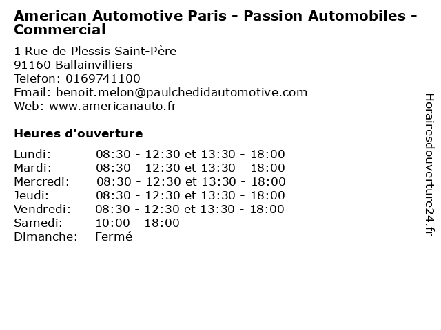1 American Automotive Paris - Passion Auto - Atelier (Distance: 0,00 km) 1 Rue de Plessis Saint-Père, 91160 Ballainvilliers american, atelier, auto, automotive, neuves, occasion, paris, passion, réparation, vente, voitures 2 Opticien La ville-du-Bois - Optic 2000 - Centre Commercial Carrefour (Distance: 0,27 km) 5 Rue de la Croix Saint-Jacques, 91620 La ville-du-Bois 2000, audio2000, audioprothésiste, bois, carrefour, centre, commercial, du, la, lentilles de contact, lunettes de soleil, lunettes de vue, oakley, optic, optic2000, opticien, opticien optic2000, ray-ban, rayban, ville 3 Paris-Saclay-Mobielectrique - Borne de recharge électrique (Distance: 0,37 km) 66 Chemin des Forêts, 91620 La Ville-du-Bois borne, de, mobielectrique, paris, recharge, saclay, électrique 4 Passion Automobiles Paris (Distance: 0,45 km) 1 Rue du Plessis Saint-Père, 91160 Ballainvilliers auto, automobiles, concessionnaire, garage, paris, passion, vente 5 Paris-Saclay-Mobielectrique - Borne de recharge électrique (Distance: 0,80 km) 101 Rue des Hauts Fresnais, 91160 Ballainvilliers borne, de, mobielectrique, paris, recharge, saclay, électrique 6 Une Pièce en Plus Longpont-sur-Orge, Paris (Distance: 1,18 km) 56/58 Avenue De La Division Leclerc, 91310 Longpont-sur-Orge en, longpont, orge, paris, pièce, plus, sur, une |
