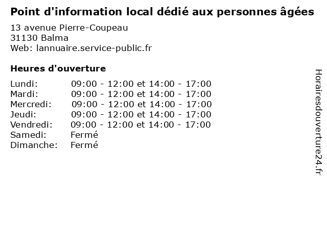 | Mardi | 09:00-12:00 et 14:00-17:00 |