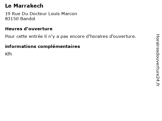 3 Le Petit Marrakech (Distance: 39,38 km) Local 7 19, 13015 Marseille ameublement, magasins, marrakech, petit 4 Le Marrakech (Distance: 48,91 km) 101 Boulevard du Front de Mer, 83230 Bormes-les-Mimosas alimentation, brasserie, le, marrakech, parking, restaurant, terrasse |