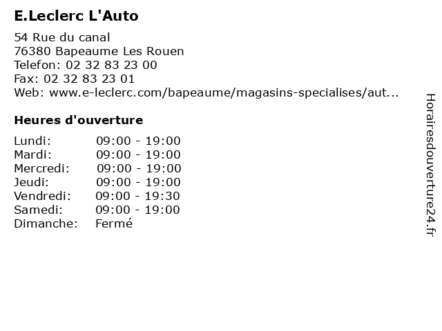 1 E.Leclerc L'Auto (Distance: 18,97 km) Route de pont de l'arche, 76320 St Pierre Les Elbeuf atelier de réparation de motos, e.leclerc, fournisseur d'alarmes de voiture, fournisseur d'enjoliveurs, l'auto, magasin d'appareils stéréo pour voiture, magasin de carrosserie auto, magasin de pneus, magasin d’accessoires automobiles, service d'esthétique automobile, service de restauration automobile 2 E.Leclerc Bapeaume (Distance: 0,01 km) 40 Rue du canal, 76380 Bapeaume Les Rouen bapeaume, e.leclerc, supermarchés 3 E.Leclerc Parapharmacie (Distance: 0,01 km) 40 Rue du canal, 76380 Bapeaume Les Rouen e.leclerc, magasin de produits de soins capillaires, parapharmacie 4 E.Leclerc Location (Distance: 0,02 km) 40 Rue du canal, 76380 Bapeaume-lès-Rouen agence de location de camions, de, e.leclerc, lieu de covoiturage, location, véhicules 5 E.Leclerc Nos Animaux (Distance: 0,03 km) 40 rue du Canal, 76380 Bapeaume Les Rouen animaux, e.leclerc, fournisseur de clôtures pour animaux domestiques, magasin d'aquariums, magasin pour animaux de compagnie, nos, toiletteur 6 E.Leclerc Jardi (Distance: 0,08 km) 40 Rue du canal, 76380 Bapeaume Les Rouen e.leclerc, jardi, Équipement pour échafaudage |
