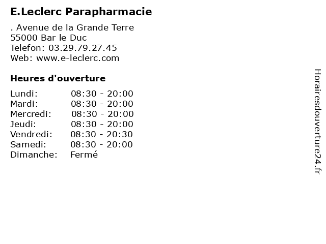 1 E.Leclerc Manège à bijoux (Distance: 0,00 km) . Avenue de la Grande Terre, 55000 Bar le Duc bijoux, e.leclerc, manège, service, services, services à la personne 2 E.Leclerc Jardi (Distance: 0,00 km) . Avenue de la Grande Terre, 55000 Bar le Duc e.leclerc, jardi, service, services, services à la personne 3 E.Leclerc Station-Service (Distance: 0,17 km) . Centre commercial de la Grande Terre, 55000 Bar le Duc e.leclerc, service, services, services à la personne, station, stations 4 E.Leclerc Animalerie (Distance: 0,86 km) - Avenue de la Grande Terre, 55000 Bar Le Duc animalerie, e.leclerc, leclerc 5 E.Leclerc Nos Animaux (Distance: 1,04 km) 3 Voie des romains, 55000 Longeville En Barrois / Bar Le Duc animaux, e.leclerc, fournisseur de clôtures pour animaux domestiques, magasin d'aquariums, magasin pour animaux de compagnie, nos, toiletteur 6 Location E.Leclerc (Distance: 1,04 km) Avenue de la Grande Terre, 55000 Bar-le-Duc e.leclerc, location |