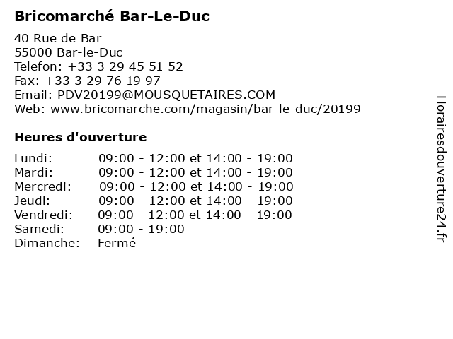 | 1 Bricomarché Bar-Le-Duc (Distance: 5,10 km) Avenue de la Grande Terre, 55000 Bar-le-Duc bar, bricomarché, duc, le 2 Bricomarché (Distance: 2,74 km) - Avenue de Paris, 55800 Bar-le-Duc bonnes affaires, bricolage, bricomarché, decoration, jardin, materiaux 3 Bricomarché Revigny-Sur-Ornain (Distance: 12,25 km) Avenue de Paris, 55800 Revigny-sur-Ornain bricomarché, ornain, revigny, sur 4 Bricomarché (Distance: 17,67 km) - Zac de la Ballastière, 55500 Ligny en Barrois bonnes affaires, bricolage, bricomarché, decoration, jardin, materiaux 5 Bricomarché Joinville (Distance: 38,06 km) Rue des Coquelicots, 52300 Joinville bricomarché, joinville 6 Bricomarché Redon (Distance: 40,56 km) Centre Commercial Cap'Nord 2 Rue Louis Guilloux, 35600 Redon bricomarché, redon |