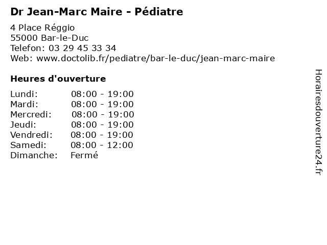 1 Dr Nacera Djafer Houari - Pédiatre (Distance: 0,12 km) 15 Rue André Maginot, 55000 Bar-le-Duc djafer, dr, houari, nacera, pedicure, pied, podologue, pédiatre, sante 2 Hussenet Jean-Marc (Distance: 4,04 km) 2 Rue du Pré Meauge, 55000 Combles-en-Barrois hussenet, jean, marc 3 Dr Jean-Louis Schaefer - Pédiatre (Distance: 19,39 km) 1 rue Albert Schweitzer, 52115 Saint-Dizier consultation, docteur, dr, jean, louis, med, médecin, médecine, pédiatre, schaefer, traitement 4 Dr Sophie Gerard - Pédiatre (Distance: 19,39 km) 1 rue Albert Schweitzer, 52115 Saint-Dizier consultation, docteur, dr, gerard, med, médecin, médecine, pédiatre, sophie, traitement 5 Dr Agathe Normand - Pédiatre (Distance: 19,39 km) 1 rue Albert Schweitzer, 52115 Saint-Dizier agathe, consultation, docteur, dr, med, médecin, médecine, normand, pédiatre, traitement 6 CH Bar-Le-Duc - Pédiatrie (Distance: 1,46 km) 1 Boulevard d'Argonne, 55012 Bar-Le-Duc bar, bureau, ch, consultation, dr, duc, le, maladie, med, médecin, médecine, pratique, pédiatrie, thérapie, traitement |