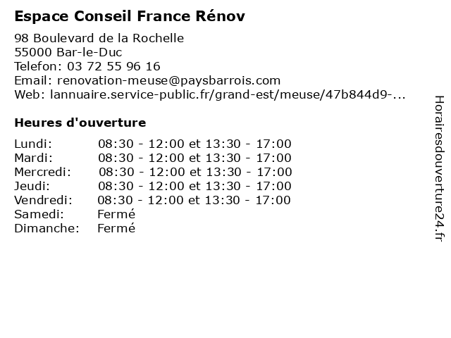 | Lundi | 08:30-12:00 et 13:30-17:00 |