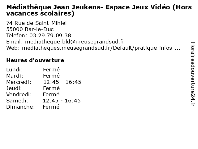 1 Médiathèque Jean Jeukens - Espace Jeux Vidéo (Vacances Scolaires) (Distance: 0,00 km) 74 Rue de Saint-Mihiel, 55000 Bar-le-Duc cd audio, cd.rom, espace, jean, jeukens, jeux, les, livres, médiathèque, pendant, revues, scolaires, vacances, vidéo 2 Médiathèque Jean Jeukens (Distance: 0,44 km) 74 Rue de Saint-Mihiel, 55000 Bar-Le-Duc cd audio, cd.rom, jean, jeukens, livres, médiathèque, revues 3 Espace Conseil France Rénov (Distance: 0,61 km) 98 Boulevard de la Rochelle, 55000 Bar-le-Duc accueil, conseil, espace, france, maison, rénov 5 Speed Laser - vacances (Distance: 1,22 km) 3A impasse des Lettres, 55000 Bar le Duc horaires, jeux, laser, salle, speed, vacances 6 Espace Aubade - Salle d'Exposition (Distance: 1,56 km) 9ter chemin de Popey, 55000 Bar-le-Duc ameublement, aubade, carrelage, chauffage, d'exposition, espace, salle, sanitaire |