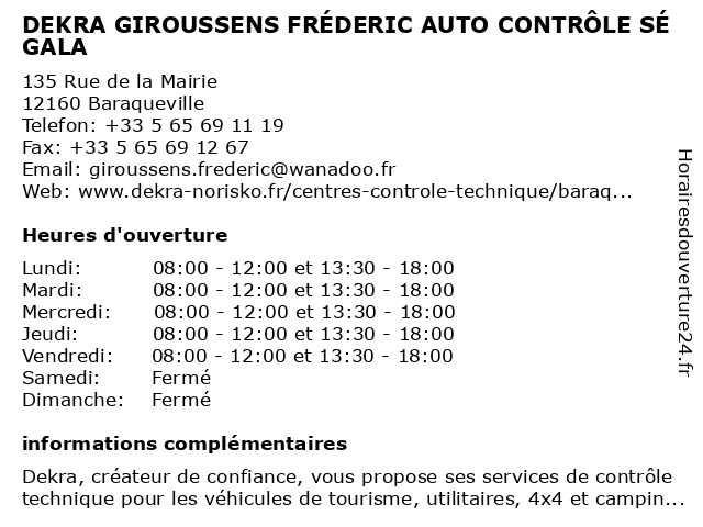 1 Centre contrôle technique DEKRA (Distance: 0,00 km) 135 Rue de la Mairie, 12160 Baraqueville 4x4, camping car, centre, collection, contrôle, dekra, diesel, electrique, essence, gazole, suv, technique, utilitaire, voiture 2 Pharmacie du Ségala (Distance: 0,39 km) 378, avenue du Centre, 12160 Baraqueville du, la médecine, la pharmacie, la santé, les soins, pharmacie, ségala 3 Rural Master - Ségala Aliments (Distance: 0,40 km) - ZA de Marengo, 12160 Baraqueville aliments, animaleries, bricolage, droguerie, jardinage, master, motoculture, rural, ségala 6 Veau d'Aveyron et du Ségala Label Rouge & IGP (Distance: 13,67 km) S/n Carrefour de l'Agriculture, 12000 Rodez d'aveyron, du, entité, entreprise, et, igp, label, rouge, société, ségala, veau |
