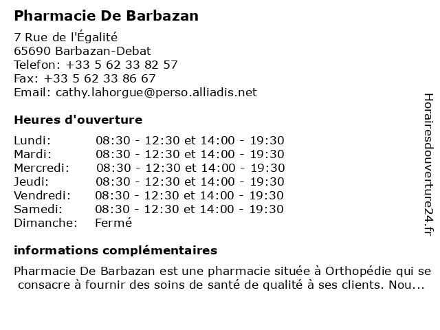 | Samedi | 08:30-12:30 et 14:00-19:30 |