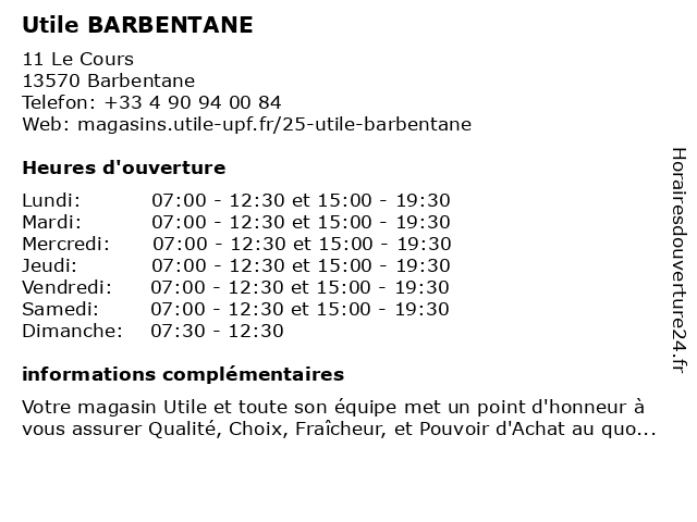 1 Utile Supermarché (Distance: 0,05 km) 11 Le Cours, 13570 Barbentane alimentation, supermarché, supérette, utile, épicerie 2 Utile Supermarché (Distance: 8,69 km) 12 Avenue Roger Salengro, 13160 Châteaurenard alimentation, fruits, légumes, supermarché, supérette, utile, épicerie 3 UTILE CHÂTEAURENARD (Distance: 8,69 km) 12-14 Avenue Roger Salengro, 13160 Châteaurenard châteaurenard, utile 4 Utile VALLABRÈGUES (Distance: 10,95 km) Boulevard Emile Jamais, 30300 Vallabrègues utile, vallabrègues 6 |