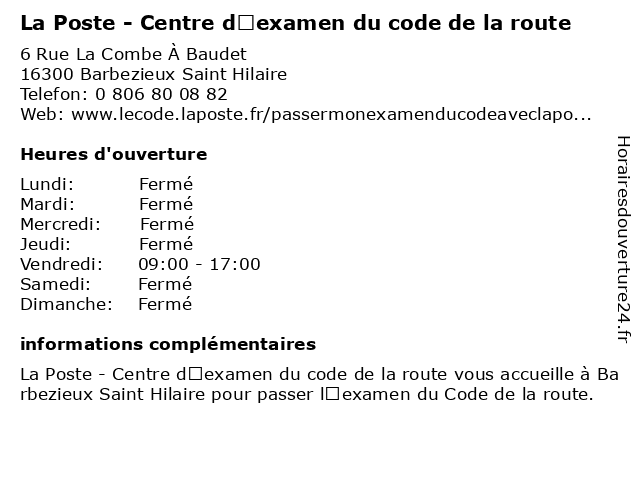 Termes de recherche pour La Poste - Centre d’examen du code de la route:poste, la, du, de, route, centre, code, d’examen, centre d'évaluation scolaire, école technique |