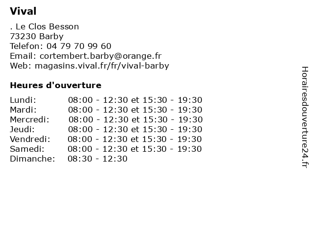 1 Vival (Distance: 2,11 km) n/a Leclos, 73230 Barby bread, deli, fish shop, gas bottles, photocopy, removing packages, vival, wine cellar 2 Vival (Distance: 2,53 km) 1353 Place de l'Europe, 73190 Challes-les-Eaux alimentation, distributeur alimentaire, superette, supermarché, vival, épicerie 3 Vival (Distance: 13,77 km) - Rue Louis Blanc Pinguet, 73250 Saint-Pierre-d'Albigny supermarché, supérette, vival, épicerie 4 Vival (Distance: 14,37 km) 49 Boulevard Président Wilson,, 73100 Aix-les-Bains droguerie, d’hypermarchés, frais, fruits et légumes, hygiène, parfumerie et autres produits non alimentaires., surgelés, vival, épicerie 5 Vival (Distance: 16,76 km) 5 Place Antoine Perrier, 73110 La Rochette supermarché, supérette, vival, épicerie 6 Vival (Distance: 19,17 km) 257 Route du Lac, 73520 La Bridoire bread, deli, fish shop, gas bottles, photocopy, removing packages, vival, wine cellar |
