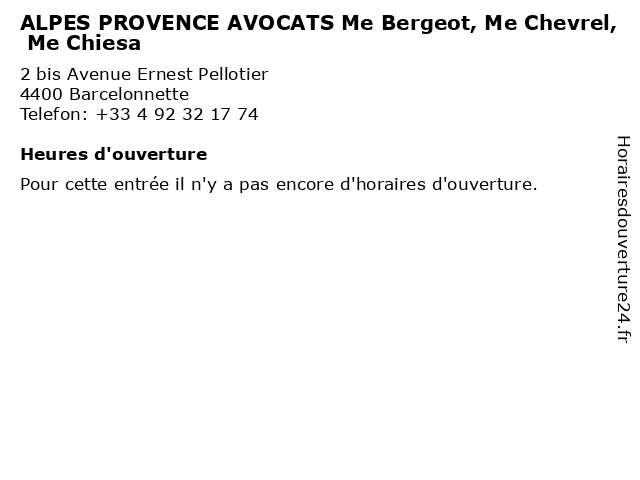 | Appeler ALPES PROVENCE AVOCATS Me Bergeot, Me Chevrel, Me Chiesa | |