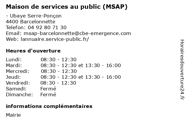 | Mardi | 08:30-12:30 et 13:30-16:00 |