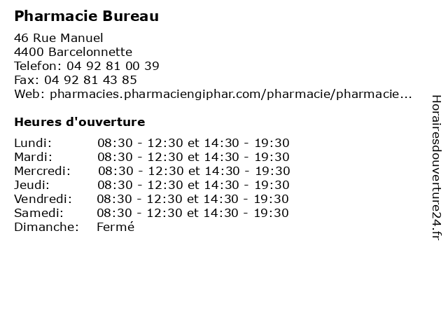| Lundi | 08:30-12:30 et 14:30-19:30 |