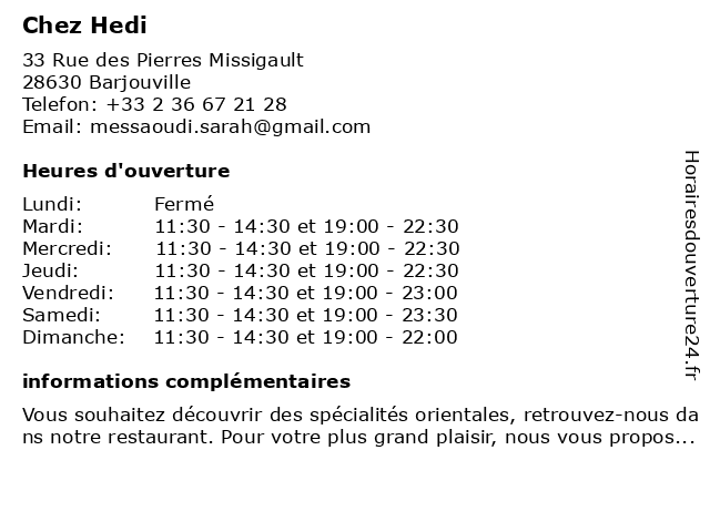 | Mardi | 11:30-14:30 et 19:00-22:30 |