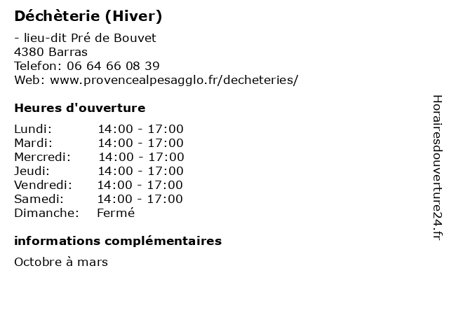 1 Déchèterie (Hiver) (Distance: 9,93 km) - Route de Barles, 04000 Digne-les-Bains bois, collecte, déchets, déchèterie, gravas, hiver, huiles, mars, octobre 2 Déchèterie (Eté) (Distance: 0,00 km) - lieu-dit Pré de Bouvet, 04380 Barras avril, bois, collecte, déchets, déchèterie, eté, gravas, huiles, septembre 3 Déchèterie (Eté) (Distance: 6,51 km) - Avenue Paul et Marguerite Jouve, 04510 Aiglun avril, bois, collecte, déchets, déchèterie, eté, gravas, huiles, septembre 4 Ugolf Digne-les-Bains - Hiver (Distance: 7,42 km) 57 Route du Chaffaut, 04000 Digne-les-Bains bains, club, digne, golf, hiver, les, sport, sportif, sports, ugolf 5 Déchèterie (Distance: 9,62 km) - ZA Les Blâches Gombert, 04160 Château-Arnoux-Saint-Auban bois, collecte, déchets, déchèterie, gravas, huiles 6 Déchèterie (Eté) (Distance: 9,93 km) - Route de Barles, 04000 Digne-les-Bains avril, bois, collecte, déchets, déchèterie, eté, gravas, huiles, septembre |