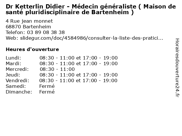 1 Dr Bostaetter Luc - Médecin généraliste ( Maison de santé pluridisciplinaire de Bartenheim ) (Distance: 0,00 km) 4 Rue jean monnet, 68870 Bartenheim bartenheim, bostaetter, de, docteur, dr, généraliste, luc, maison, medecin, médecin, pluridisciplinaire, santé 2 Dr Nolte Marie - Médecin généraliste ( Maison de santé pluridisciplinaire de Bartenheim ) (Distance: 0,00 km) 4 Rue jean monnet, 68870 Bartenheim bartenheim, de, docteur, dr, généraliste, maison, marie, medecin, médecin, nolte, pluridisciplinaire, santé 3 Dr Herold Homatter Catherine - Médecin généraliste ( Maison de santé pluridisciplinaire de Bartenheim ) (Distance: 0,00 km) 4 Rue jean monnet, 68870 Bartenheim bartenheim, catherine, de, docteur, dr, généraliste, herold, homatter, maison, medecin, médecin, pluridisciplinaire, santé 4 Dr Ott Huguette - Médecin généraliste ( Maison de santé pluridisciplinaire de Bartenheim ) (Distance: 0,00 km) 4 Rue jean monnet, 68870 Bartenheim bartenheim, de, docteur, dr, généraliste, huguette, maison, medecin, médecin, ott, pluridisciplinaire, santé 5 L'Ecole de Conduite Didier (Distance: 7,11 km) 33 Rue du Général de Gaulle, 68220 Hésingue conduite, de, didier, ecole de conduite, formation, l'ecole, permis 6 L'Ecole de Conduite Didier (Distance: 7,26 km) 54 Rue de Mulhouse, 68300 Saint-Louis conduite, de, didier, ecole de conduite, formation, l'ecole, permis |