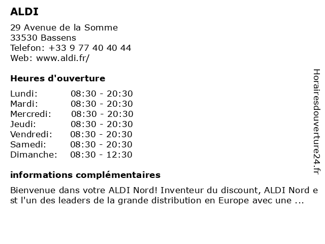 1 Aldi (Distance: 0,02 km) 23 Avenue de la Somme, 33530 Bassens aldi, alimentaire, alimentation, distributeur, fruits, grande distribution, hypermarché, leader, légumes, price, supermarché, supérette, épicerie 2 Aldi (Distance: 3,37 km) - Rue des Garosses, 33310 Lormont aldi, alimentaire, alimentation, distributeur, fruits, grande distribution, hypermarché, leader, légumes, price, supermarché, supérette, épicerie 3 Aldi (Distance: 5,63 km) 211-233 boulevard Alfred Daney, 33000 Bordeaux aldi, courses, magasin, supermarché, épicerie 4 Aldi (Distance: 9,84 km) 90-94 Boulevard du Président Wilson, 33000 Bordeaux aldi, alimentaire, alimentation, distributeur, fruits, grande distribution, hypermarché, leader, légumes, price, supermarché, supérette, épicerie 5 Aldi (Distance: 10,32 km) - Lieu-dit Bonneau, 33270 Bouliac aldi, alimentaire, alimentation, distributeur, fruits, grande distribution, hypermarché, leader, légumes, price, supermarché, supérette, épicerie 6 Aldi (Distance: 11,20 km) 99 Boulevard Albert 1er, 33000 Bordeaux aldi, alimentaire, alimentation, distributeur, fruits, grande distribution, hypermarché, leader, légumes, price, supermarché, supérette, épicerie |