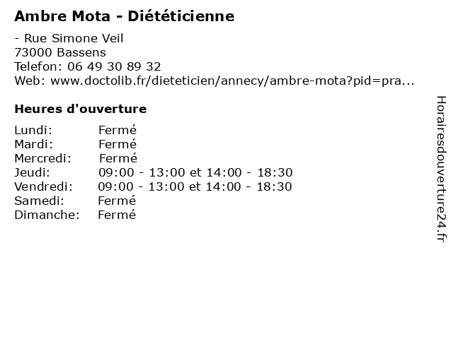 | Jeudi | 09:00-13:00 et 14:00-18:30 |