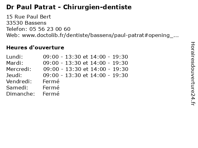 | Lundi | 09:00-13:30 et 14:00-19:30 |