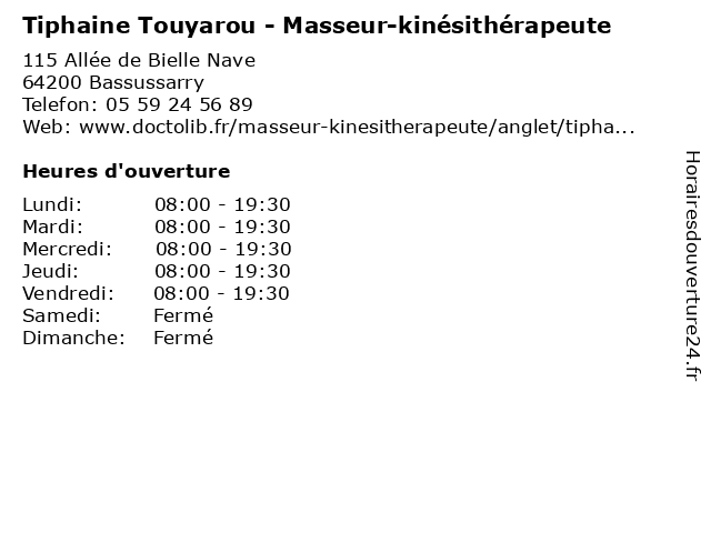 1 Pharmacie Tiphaine (Distance: 10,89 km) 8 square Albert Mora, 40220 Tarnos herboristerie, médicaments, paramédical, parapharmacie, pharmacie, pharmacien, santé, tiphaine, traitements 2 Robin Soulignac Durruty - Masseur-kinésithérapeute (Distance: 0,02 km) 115 Allée de Bielle Nave, 64200 Bassussarry docteur, durruty, kine, kinesitherapeute, kinésithérapeute, masseur, robin, soulignac 3 Morgane Thene - Masseur-kinésithérapeute (Distance: 5,86 km) 63 Rue Bourgneuf, 64100 Bayonne docteur, kine, kinesitherapeute, kinésithérapeute, masseur, morgane, thene 4 Manon Tisseyre - Masseur-kinésithérapeute (Distance: 7,87 km) - Route de Xopolo, 64480 Ustaritz docteur, kine, kinesitherapeute, kinésithérapeute, manon, masseur, tisseyre 5 Danel Etxabarri - Masseur-kinésithérapeute (Distance: 10,07 km) 118 Avenue de Jalday, 64500 Saint-Jean-de-Luz danel, docteur, etxabarri, kine, kinesitherapeute, kinésithérapeute, masseur 6 Sandy Manson - Masseur-kinésithérapeute (Distance: 21,33 km) - Maison Lili Péan, Le Bourg, 64240 Bonloc docteur, kine, kinesitherapeute, kinésithérapeute, manson, masseur, sandy |