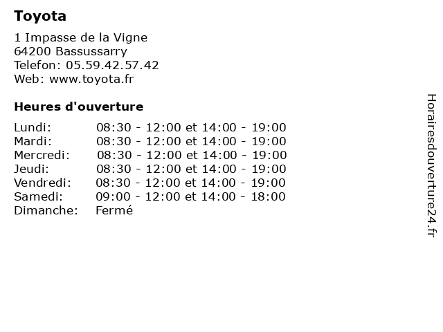 1 Toyota (Distance: 19,68 km) . De Berroueta, 94122 Urrugne automobiles, concéssionnaire, garage, motos, toyota 2 Toyota (Apres-Vente) (Distance: 0,00 km) 1 Impasse de la Vigne, 64200 Bassussarry apres, automobiles, concéssionnaire, garage, motos, toyota, vente 3 Toyota (Apres-Vente) (Distance: 50,33 km) . Route de Carrere, 40990 Saint Vincent Paul apres, automobiles, concéssionnaire, garage, motos, toyota, vente 4 Toyota (Distance: 59,21 km) 1044 Avenue Marcel Paul, 64300 Orthez automobiles, concéssionnaire, garage, motos, toyota 5 Toyota (Apres-Vente) (Distance: 59,21 km) 1044 Avenue Marcel Paul, 64300 Orthez apres, automobiles, concéssionnaire, garage, motos, toyota, vente 6 Škoda Auto (Distance: 1,86 km) 1 Chemin De Lachiste, 64100 Bayonne accessoires, auto, automobiles, automobiles neuves, garage occasion, pièces détachées, Škoda |