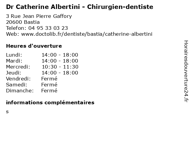 1 Dr Andrea Albertini - Médecin généraliste (Distance: 1,05 km) 604 Chemin de Falconaja, 20600 Bastia albertini, andrea, consultation, docteur, dr, généraliste, med, médecin, médecine, traitement 2 Dr Catherine Vuillemin - Médecin généraliste (Distance: 1,05 km) 604 Chemin de Falconaja, 20600 Bastia catherine, consultation, docteur, dr, généraliste, med, médecin, médecine, traitement, vuillemin 3 Exco Albertini & Associés - Experts Comptables (Distance: 2,30 km) 29 boulevard Paoli, 20200 Bastia albertini, associés, cabinet, comptable, comptables, comptes, contrôles, exco, expertise, experts, finances, gestion, reporting 4 Maître Charlotte Albertini - Avocate (Distance: 2,55 km) 15 boulevard du Général de Gaulle, 20200 Bastia albertini, avocate, avocats, cabinet, charlotte, conseils, contentieux, juridique, justice, litiges, maître, services 6 Elisabeth Albertini - Pédicure-podologue (Distance: 2,92 km) - Rue Paratojo, 20200 Bastia albertini, elisabeth, médecin, médecine, médical, pharmaceutique, podologue, pédicure, secretariat, traitement |