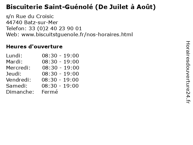 1 Biscuiterie Saint-Guénolé (D'avril à Septembre) (Distance: 0,00 km) s/n Rue du Croisic, 44740 Batz-sur-Mer biscuiterie, biscuits, d'avril, guénolé, gâteaux, magasins, saint, septembre 2 Biscuiterie des Marais (Distance: 0,30 km) 1 Route du croisic, 44350 Guerande biscuiterie, des, guerande, marais 3 Biscuiterie des Marais (Distance: 1,58 km) . route du Croisic, 44350 Guérande biscuiterie, biscuits, boutique, condiments, confiserie, des, marais, sel 4 Biscuiterie La Trinitaine (Distance: 2,57 km) 14 Quai De La Petite Chambre, 44490 Le Croisic alimentation, biscuiterie, biscuits, gateaux, la, trinitaine 5 Biscuiterie Du Croisic (avril à juin et septembre) (Distance: 2,60 km) 10 Quai de la Petite Chambre, 44490 Le Croisic aven, avril, biscuiterie, boulangeries, croisic, du, détail, et, juin, pont, septembre 6 Chocolaterie Biscuiterie Larnicol Mof (Distance: 2,85 km) Maison Georges Larnicol, 44490 Le Croisic biscuiterie, boulangeries, chocolaterie, détail, larnicol, mof |