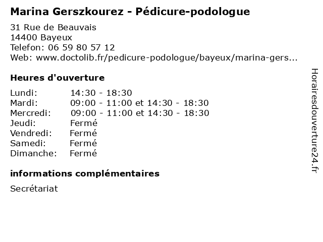 1 Fanny Gerszkourez - Ostéopathe (Distance: 0,00 km) 31 Rue de Beauvais, 14400 Bayeux fanny, gerszkourez, ostéo, ostéopathe, ostéopathes, soins 2 Sébastien Malice - Pédicure-podologue (Distance: 0,14 km) 42 Rue de Beauvais, 14400 Bayeux consultation, docteur, malice, med, médecin, médecine, podologue, pédicure, secrétariat, sébastien, traitement 3 Elodie Guchet - Pédicure-podologue (Distance: 0,14 km) 42 Rue de Beauvais, 14400 Bayeux consultation, docteur, elodie, guchet, med, médecin, médecine, podologue, pédicure, secrétariat, traitement 4 Marie Landais - Pédicure-podologue (Distance: 0,14 km) 42 Rue de Beauvais, 14400 Bayeux consultation, docteur, landais, marie, med, médecin, médecine, podologue, pédicure, secrétariat, traitement 5 Maxime Lebourgeois - Pédicure-podologue (Distance: 0,14 km) 42 Rue de Beauvais, 14400 Bayeux consultation, docteur, lebourgeois, maxime, med, médecin, médecine, podologue, pédicure, secrétariat, traitement 6 Florence Molicard - Pédicure-podologue (Distance: 0,96 km) 16-18 rue du Marché, 14400 Bayeux florence, molicard, pieds, podologue, pédicure, soins |