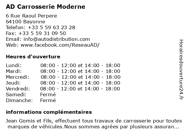 1 Carrosserie Ayensa (Distance: 2,26 km) Floquet 42 Rue Charles, 64100 Bayonne ayensa, carrosserie, neuves, occasion, vente, voitures 2 Carrosserie Castaings (Distance: 3,00 km) 21 rue de la Tillole, 64100 Bayonne automobile, carrosserie, castaings, entretien, garage, réparation, vente 3 Volkswagen ( Atelier Peinture Carrosserie ) (Distance: 3,43 km) . Route de Cambo, 64100 Bayonne atelier, automobiles, carrosserie, concéssionnaire, garage, motos, peinture, volkswagen 4 Carrosserie Santos (Distance: 4,37 km) 6 Rue de Lohitzun, 64990 Saint-Pierre-d'Irube carrosserie, santos 5 Portet Carrosserie (Distance: 4,54 km) 1 Boulevard du b.a.b, 64200 Biarritz biarritz, carrosserie, portet 6 Carrosserie Axial - Carrosserie du Golf-Castaings (Distance: 5,05 km) 165 impasse des Vignes, 64200 Bassussarry atelier, automobile, axial, carrosserie, castaings, du, garage, golf, reparation |