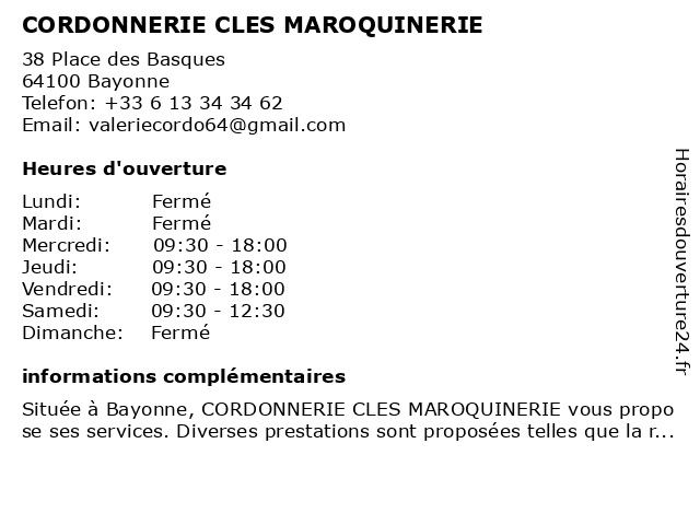 1 Paul Marius - Maroquinerie (Distance: 0,38 km) 25 Rue Victor Hugo, 64100 Bayonne accessoires, artisans, intemporelle, marius, maroquinerie, objets, oubliée, paul, rares 3 Cordonnerie Chronoclef (Distance: 3,07 km) 2-4 avenue du Portou, 64990 Saint-Pierre-d'Irube chronoclef, clé, cordonnerie, imprimerie, reproduction, réparation 4 Cordonnerie des Cigales (Distance: 17,54 km) 51 Boulevard des Cigales, 40130 Capbreton cigales, cordonnerie, des 5 Bleu Minute (Distance: 3,70 km) 56 boulevard Jacques Duclos, 40220 Tarnos bleu, cordonnerie, minute, services 6 Brico Pro (Distance: 17,57 km) - zaliondoa, 64240 Hasparren atelier, brico, carte de fidelite, cles minute, conseil, contrat de maintenance, decoupe, financement, pro, sav |