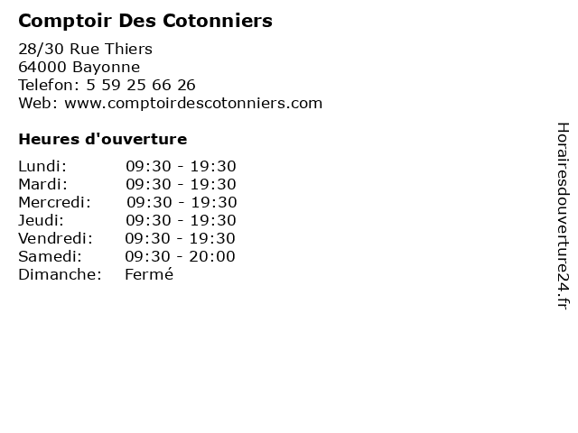 1 Comptoir des Cotonniers (Distance: 6,76 km) 17 Avenue Place Clemenceau, 64200 Biarritz accessoires, comptoir, cotonniers, des, femme, mode, vêtements 2 Comptoir des Cotonniers (Distance: 6,78 km) 1 Rue de la Poste, 64200 Biarritz accessoires, chaussure, comptoir, cotonniers, des, femme, mode, vêtements 3 Comptoir Des Cotonniers (Distance: 18,99 km) 185 Avenue Paul Lahary, 40150 Soorts-Hossegor accessoires, chaussures, comptoir, cotonniers, des, mode femme 4 Gold.fr - Le Comptoir National Bayonne (Distance: 0,12 km) 25 Rue du Port Neuf, 64100 Bayonne bayonne, comptoir, gold.fr, le, national 5 Le Comptoir Irlandais (Distance: 0,13 km) 21 Rue Lormand, 64100 Bayonne bijouterie, comptoir, irlandais, le, maison, mode 6 Le Comptoir de la Bière (Distance: 0,22 km) 7 Rue de Port de Castets, 64100 Bayonne alcool, bar, bière, comptoir, de, la, le, vente, vins |