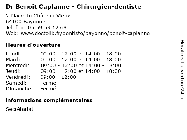 1 Dr Camille Caplanne - Chirurgien-dentiste (Distance: 0,61 km) 24 Avenue de Marhum, 64100 Bayonne camille, caplanne, chirurgien, dent, dentiste, docteur, dr, soins 2 Dr Benoit Scarwell - Médecin nucléaire (Distance: 1,03 km) 13 avenue de l'Interne Jacques Loëb, 64100 Bayonne benoit, consultation, docteur, dr, med, médecin, médecine, nucléaire, scarwell, traitement 3 Dr. Didier Caplanne- Médecine générale (Distance: 1,33 km) 6 Chemin de la Marouette, 64100 Bayonne caplanne, consultation, didier, docteur, dr., générale, médecine, santé 4 Dr Benoit Lahon - Chirurgien thoracique et cardio-vasculaire (Distance: 2,45 km) 2 Allée Docteur Robert Lafon, 64100 Bayonne benoit, cardio, chirurgien, consultation, docteur, dr, et, lahon, med, médecin, médecine, thoracique, traitement, vasculaire 5 Monsieur Benoit Galopin (Distance: 3,13 km) Rue De Salis, 64600 Anglet benoit, boucheries, galopin, poissonneries 6 Dr Benoit Hecquet - Radiologue (Distance: 4,88 km) - Rue de l’Estagnas, 64200 Biarritz benoit, consultation, docteur, dr, hecquet, med, médecin, radiologue, traitement |
