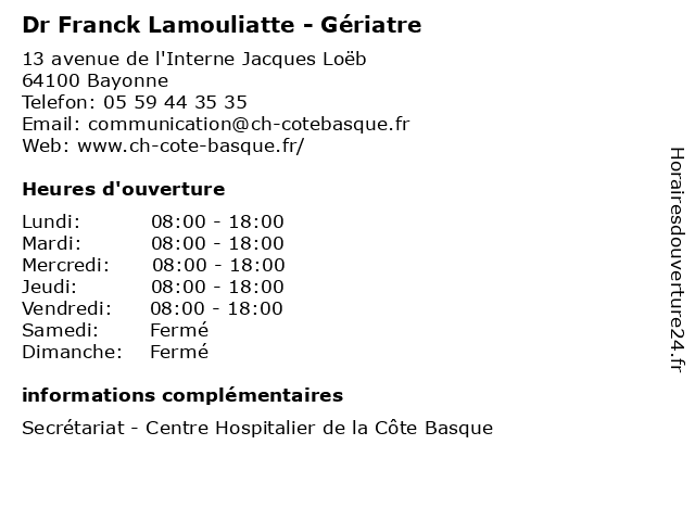 1 Dr Franck Audemar - Gastro-entérologue et hépatologue (Distance: 0,00 km) 13 avenue de l'Interne Jacques Loëb, 64100 Bayonne audemar, consultation, docteur, dr, entérologue, et, franck, gastro, hépatologue, med, médecin, médecine, traitement 2 Dr Franck de Cazanove - Pharmacien hospitalier (Distance: 0,16 km) 13 avenue de l'interne Jacques Loëb, 64109 Bayonne basque, bayonne, cachet, cazanove, centre, côte, de, dr, franck, hospitalier, la, medicament, pharmacie, pharmacien 3 Piochon Franck Patrick Hubert (Distance: 2,62 km) Droit 1Er Etage, 64100 Bayonne agents, directeurs, franck, hubert, immobiliers, patrick, piochon 4 Perie Franck Jean-Claude (Distance: 4,49 km) 16 Chemin De Mendixka, 64200 Bassussarry claude, franck, jean, perie, restaurants 5 Franck Provost (Distance: 4,98 km) 58 Boulevard Jacques Duclos, 40220 Tarnos coiffure, franck, provost, salon 6 Franck Provost (Distance: 5,28 km) 1 Rue des Hirondelles, 64200 Biarritz beaute, coiffure, franck, provost, services |