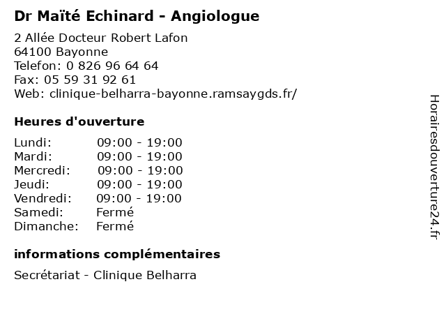 1 Dr Pierre Combes - Angiologue (Distance: 0,00 km) 2 Allée Docteur Robert Lafon, 64100 Bayonne angiologue, combes, consultation, docteur, dr, med, médecin, médecine, pierre, traitement 2 Goity Maïté (Distance: 2,11 km) 51 pont Pannecau, 64100 Bayonne atelier, décoration, eskulana, goity, maïté, tapisserie 3 Dr Bruno Cordon - Angiologue (Distance: 2,20 km) 13 Avenue de l'Interne Jacques Loeb, 64100 Bayonne angiologue, bruno, consultation, cordon, docteur, dr, med, médecin, traitement 4 Maïté Diharce - Naturopathe (Distance: 2,93 km) 23 Avenue de Marhum, 64100 Bayonne diharce, maïté, medecin, naturopathe, plante, sante 5 Coiffure Maïté (Distance: 5,63 km) 129 Avenue de l'Adour, 64600 Anglet beauté, coiffure, coiffures, coloristes, maïté 6 Dr Maïté Catussie-Echinard - Angiologue (Distance: 7,04 km) 21 rue de Estagnas, 64200 Biarritz angiologue, catussie, consultation, docteur, dr, echinard, maite, maïté, med, médecin, médecine, traitement |